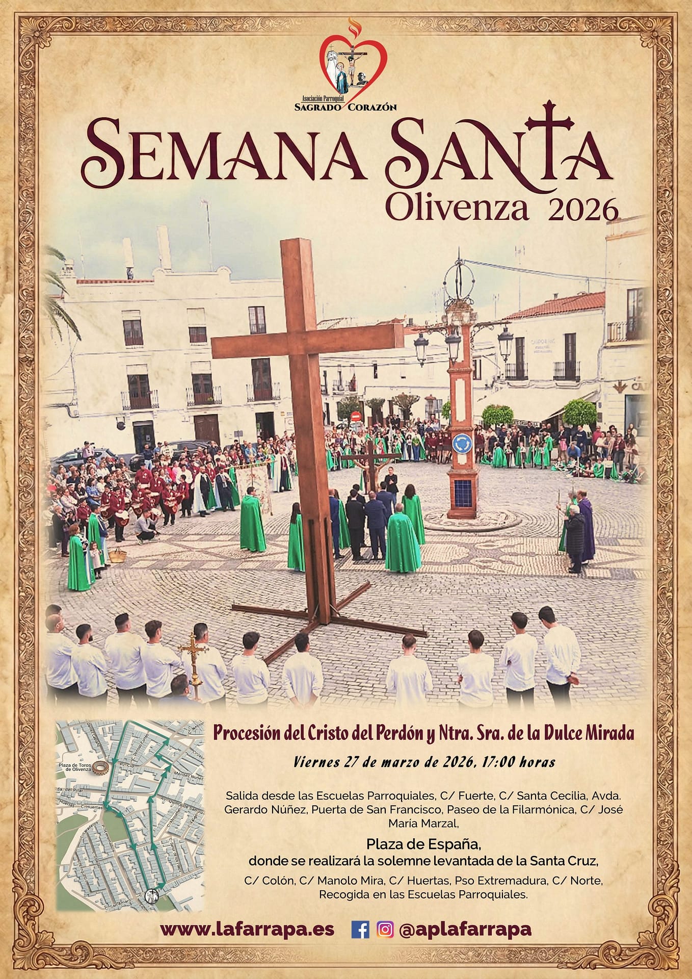 El cartel de este año refleja el espíritu de comunidad que caracteriza a nuestra asociación. La imagen principal captura la solemnidad de nuestra levantá de la Santa Cruz, invitando a todos los oliventinos a acompañar al Cristo del Perdón y a Nuestra Señora de la Dulce Mirada en nuestra estación de penitencia.